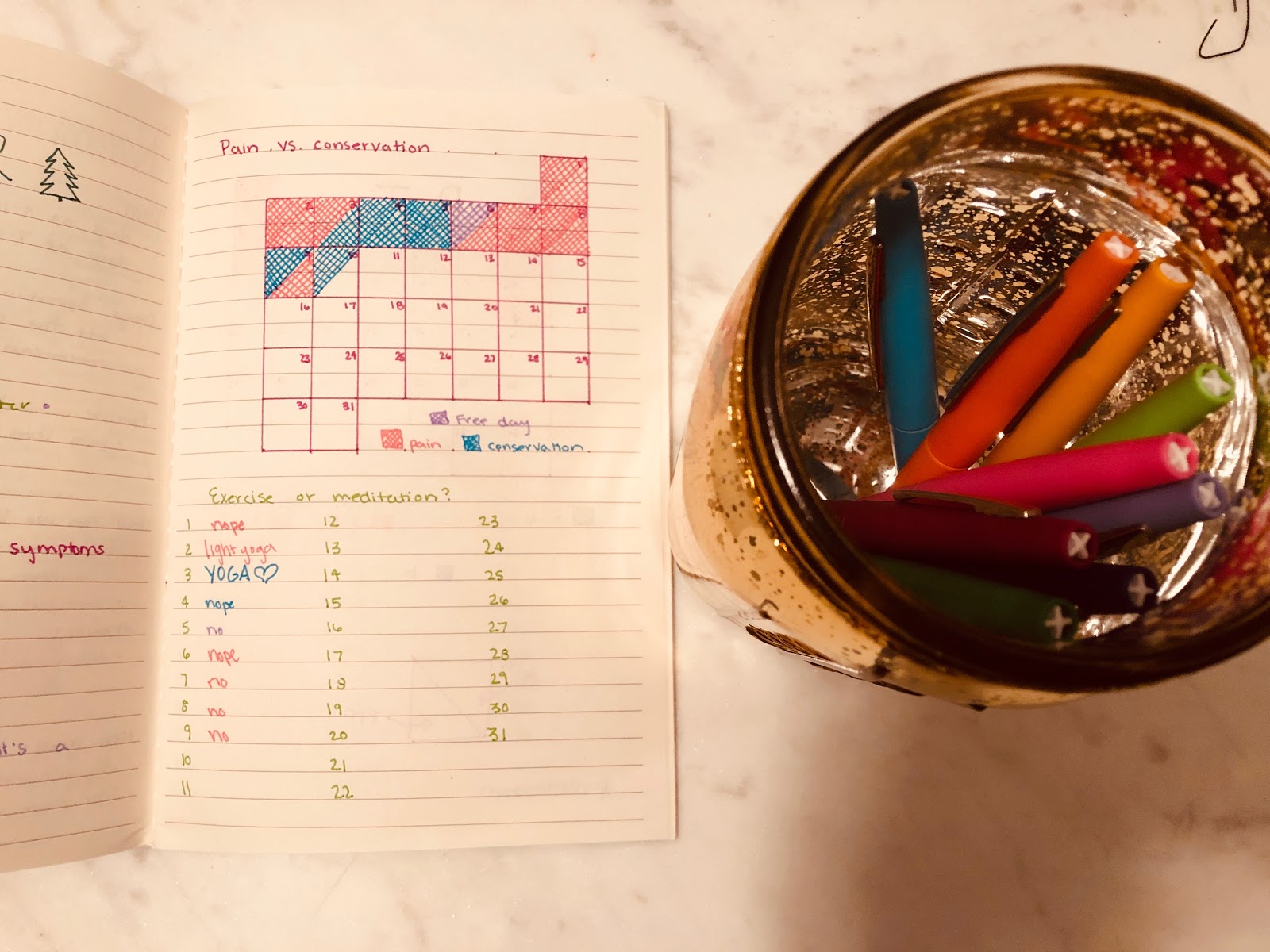 So for me, I wanted to find a way to track pain levels in a visual way to then compare to things like my “did I leave the couch/whats keeping me on the couch” charts. That chart is also in the calendar style.