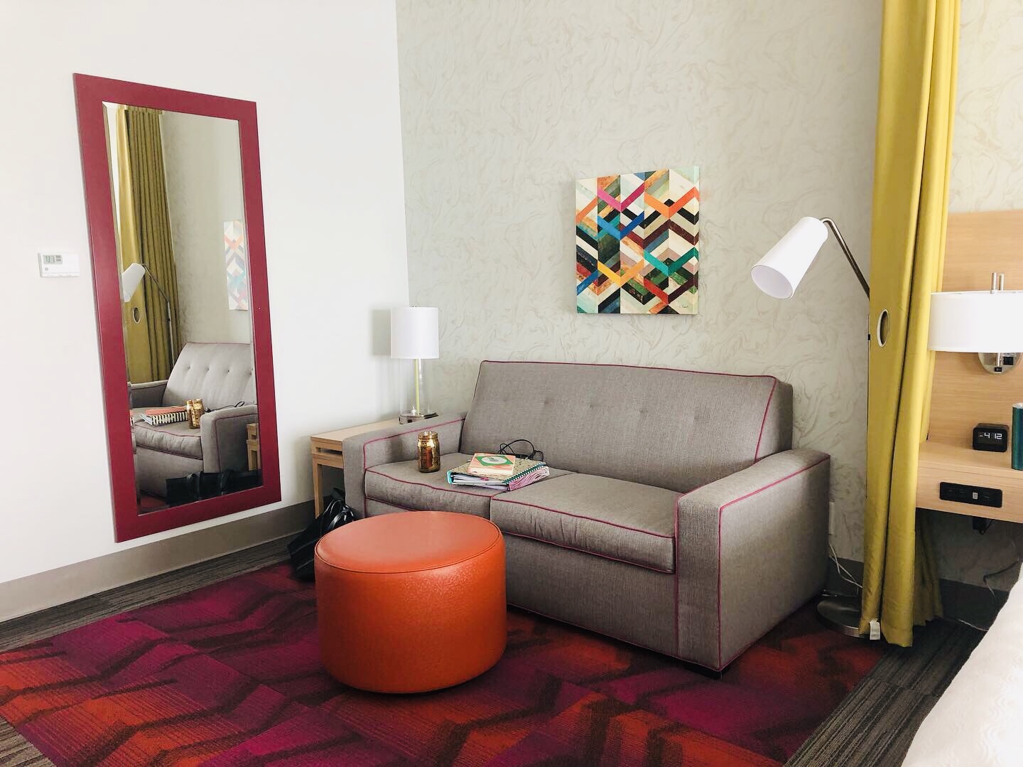 Initially, I was taken aback with how incredibly bright everything was. The hotel hallways were lined with the brightest florescent lights available and the walls were a bright maroon. Thankfully, hotels don’t force you to sleep in the hallways. I was thrilled to see my hotel room had incredibly effective black out blinds and multiple ambiance and task lights that allowed me to instantly change the feel of the room. This was the largest accessibility win in my opinion as it not only is perfect for those of us who are sensitive to light, but works to accommodate those who get up later than the sun and need it to be darker.