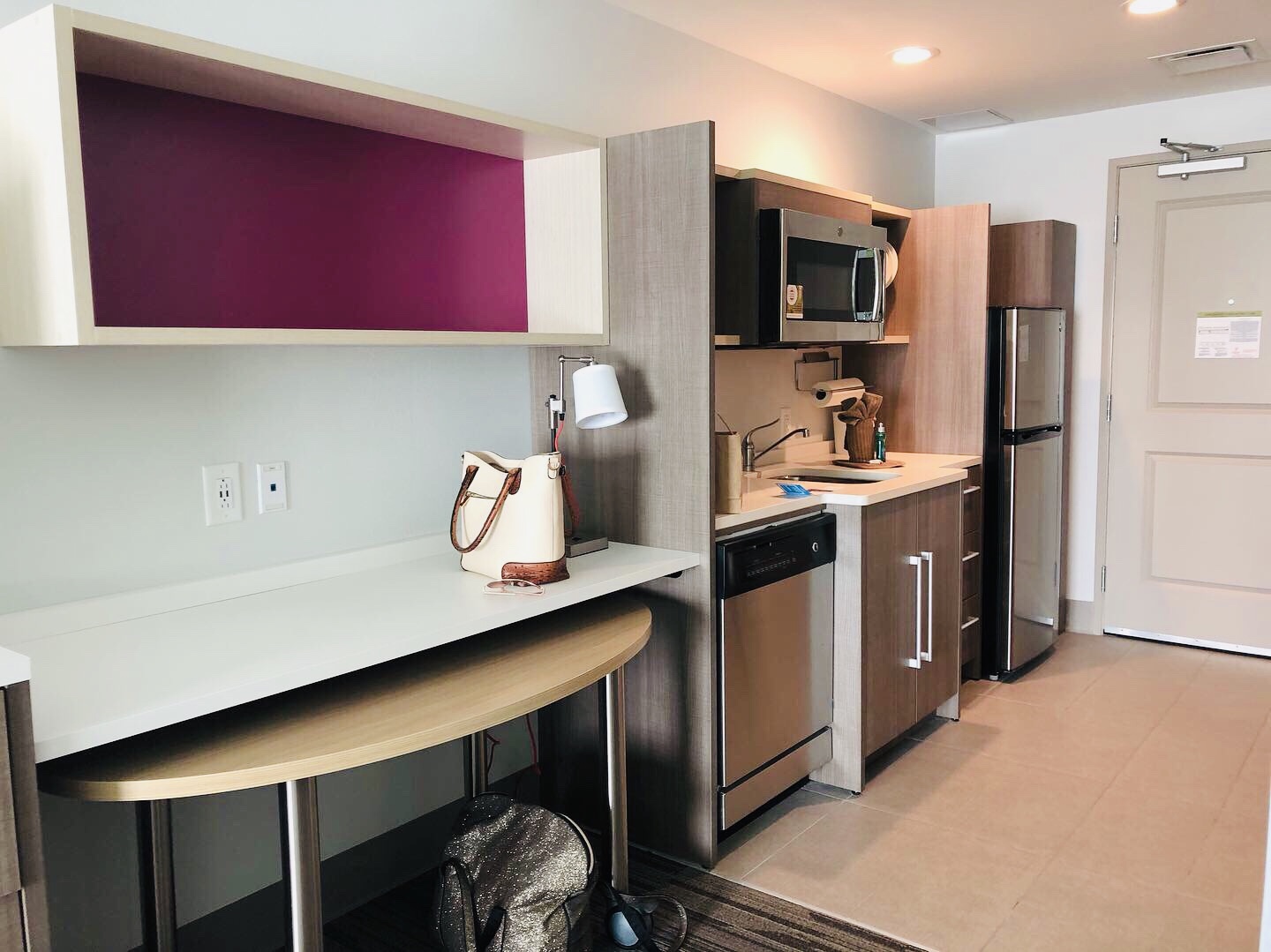 - ADA Compliance – the fixtures and switches were all at a height that would be comfortably within reach of an individual in a chair and the desk space and “dining table” both had proper space to roll under comfortably. There is proper space for both radial turns and t-shaped turns for wheelchair users.