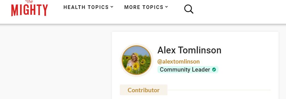 Image description: heading on the Mighty @alextomlinson with verified community leader banner
