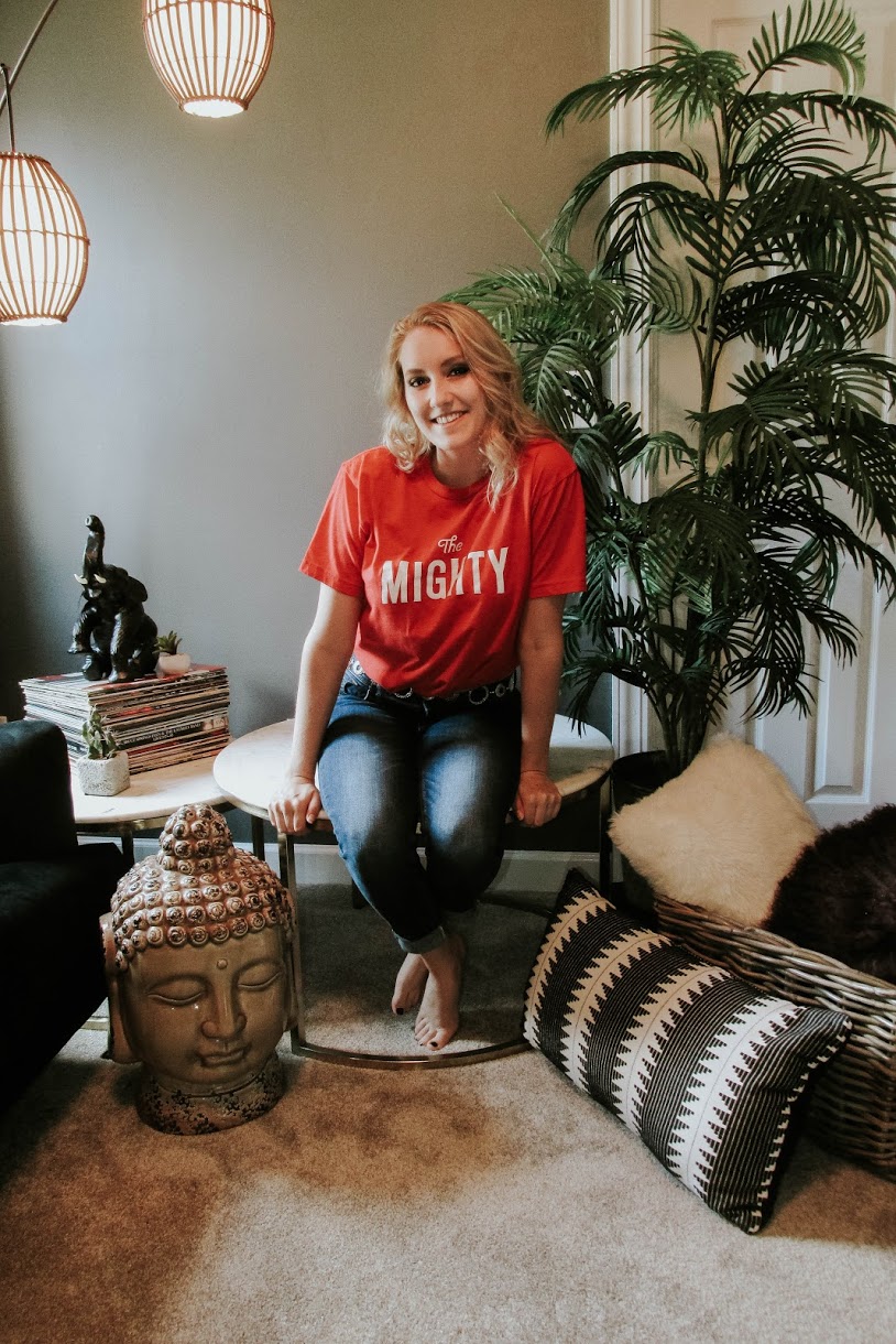 Image Description: girl with blonde hair wearing red “The Mighty” shirt and jeans sitting on white coffee tables surrounded by things that represent her including pillows, old vinyl records, plants, and a Buddha head.