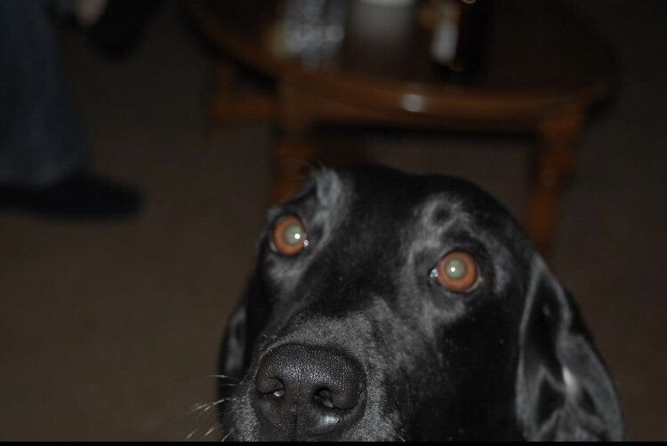 Image description – black dog peering up from the bottom of the photo with big brown eyes.