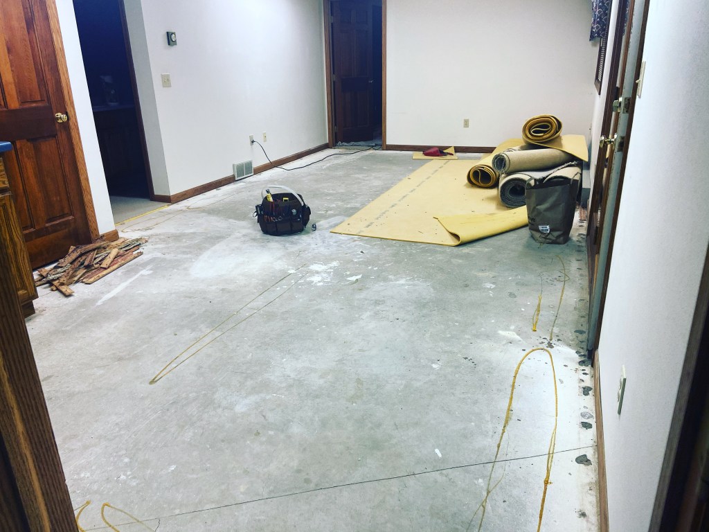 Our first order of business – after the previous owners moved out of course – was to rip up the floors and see what we were working with. I’d initially considered leaving the concrete exposed and doing a painted tile pattern to save on costs, but the condition of the concrete and the thought of how cold concrete would be in winter lead to planning for something a bit nicer.