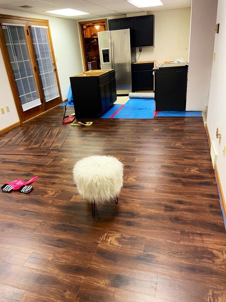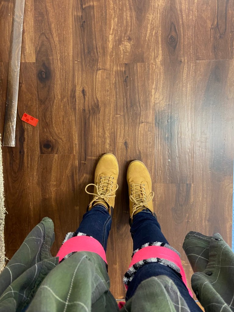 After working through the first few rows, I’d gotten the hang of it and my dad and I worked together to efficiently lay the rest. I connected the boards and pounded them into place, while he cut the planks to the proper size. This took awhile as the work is hard on our hands and frankly, exhausting. The final stretch of flooring was the hardest. We couldn’t place appliances or cabinets onto the vinyl so my dad had to make precise cuts to get the boards into place.