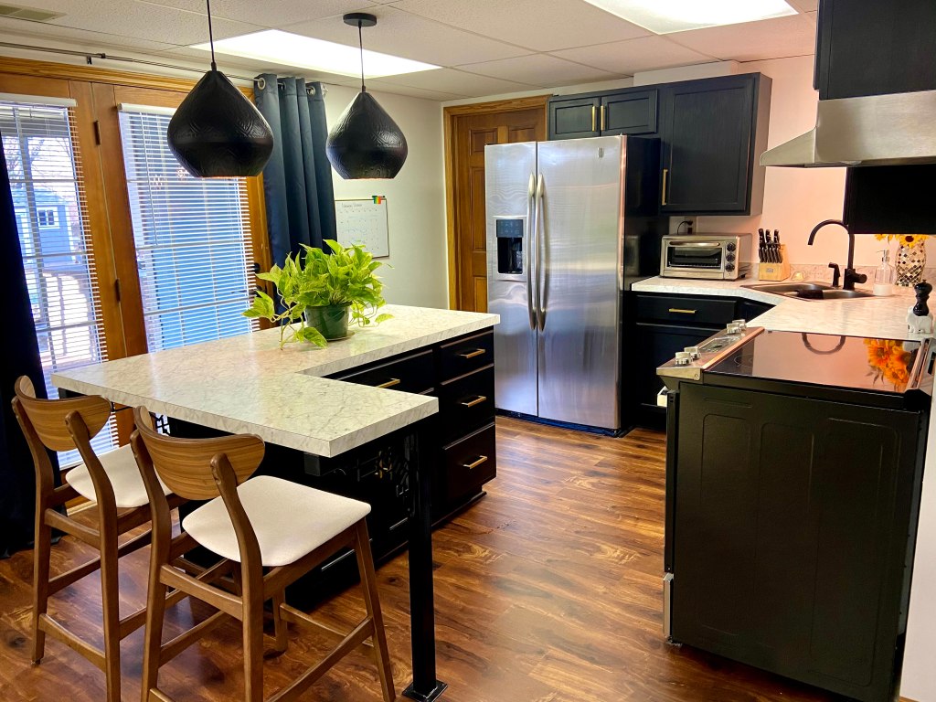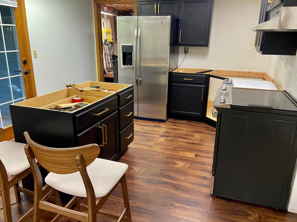 With the floors finished, my dad installed quarter round around the edges of the room and, black quarter round matching the cabinetry around the the base cabinets and island – this hides the edges of the floor that aren’t super even allowing the vinyl planks to expand and contrast without causing the floor to buckle.