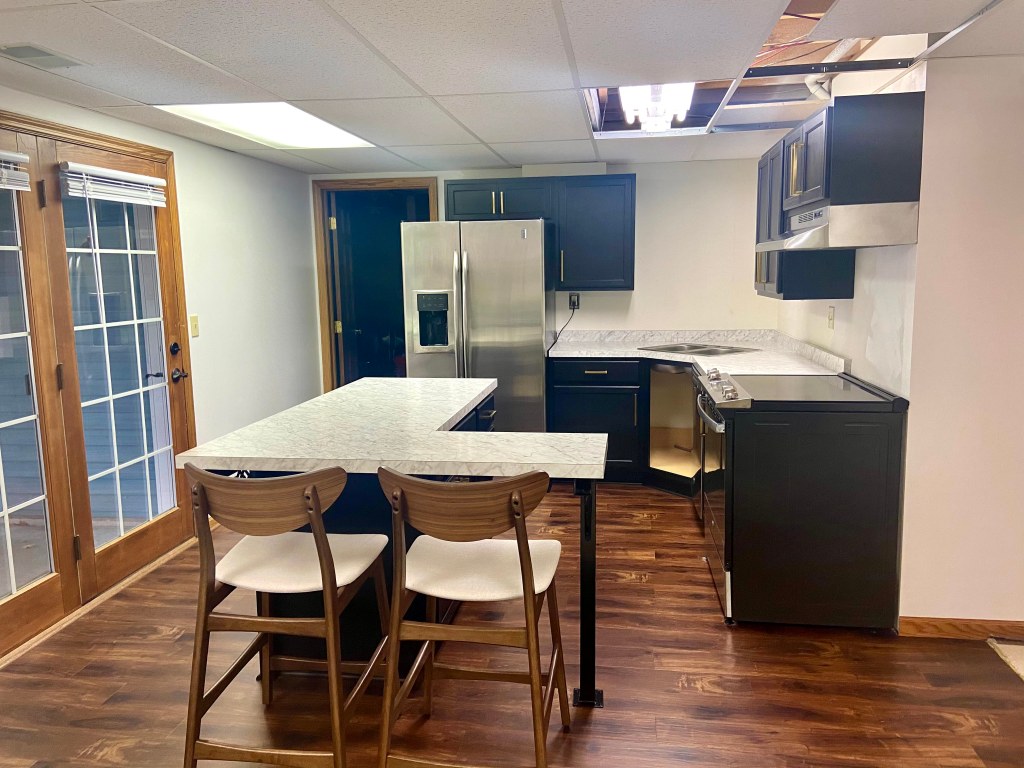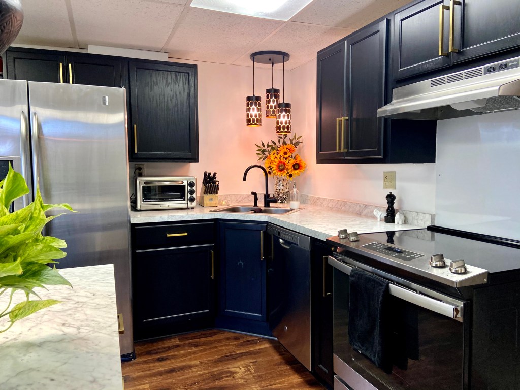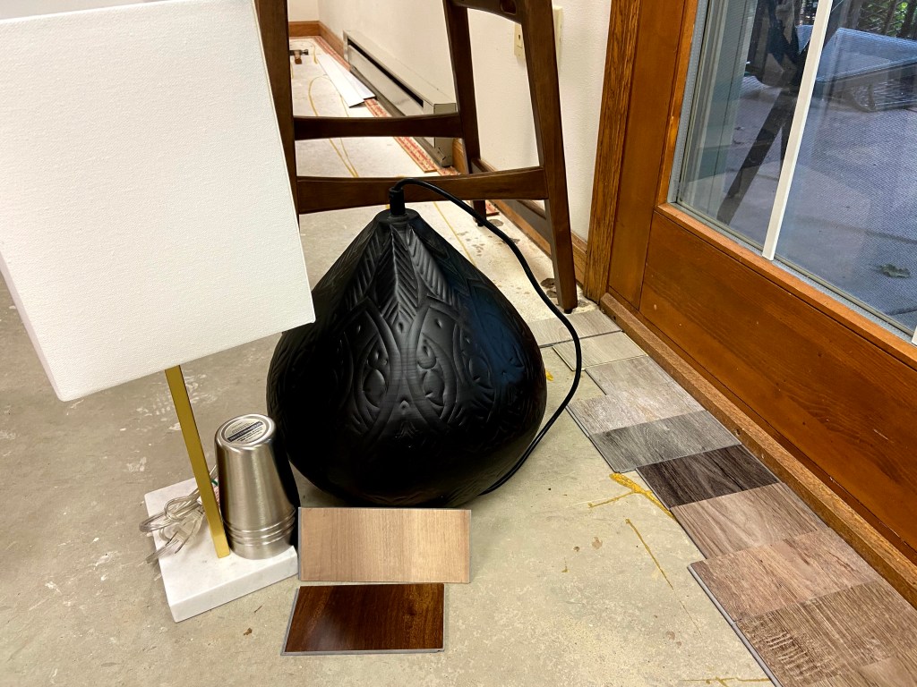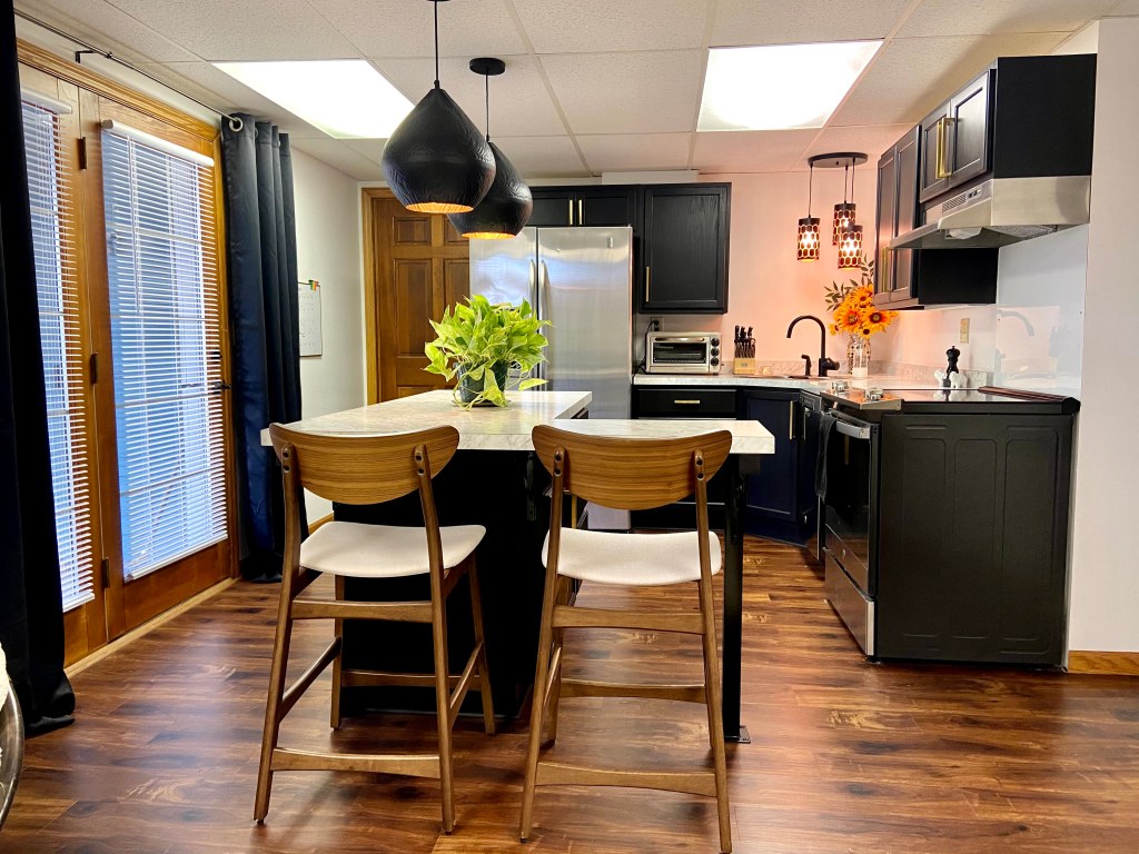 After getting the carpeting up, it came time to design. I had already selected black cabinetry, with white marble tops, stainless appliances, and gold handles. I’d also previously purchased two large black pendants that would end up above my island. I had existing barstools to work with. It came down to either a light blonde wood or a deep espresso.