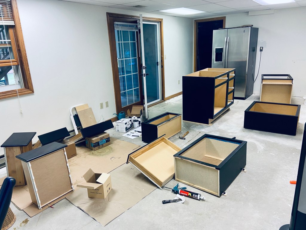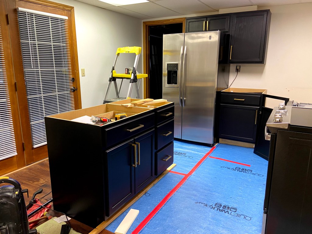 With appliances delivered, we waited on the last few cabinets to arrive before installing them – which involved a lot of heavy lifting and building in additional supports into the storage closet so cabinets hung on the wall would be sturdy.
