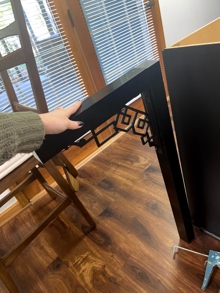 Because of budgetary restraints, we purchased fully unfinished cabinets. I spent days sanding them down to prep for paint and then painted them in a slightly matte black deco cabinet paint.