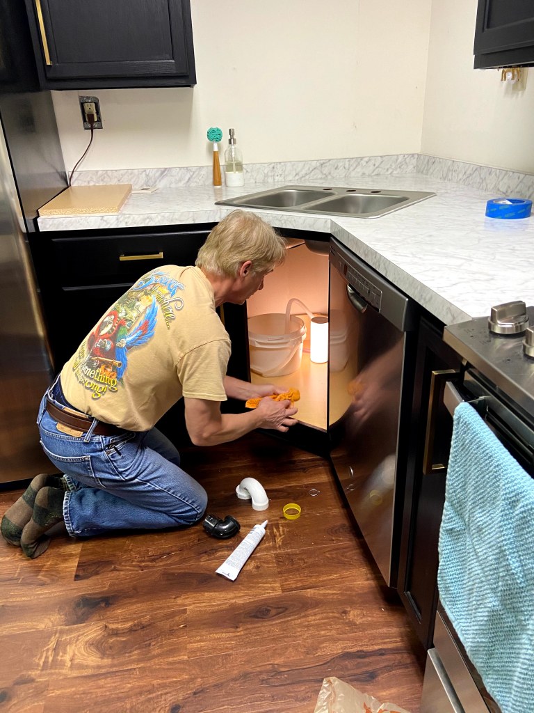 The plumbing was a bit finicky as we had to work with the existing height of the plumbing from the small bar that had been here prior. With the sink positioned further away and at an angle, we were able to get a garbage disposal installed. One of the benefits of the corner sink was opening up space to have a dishwasher installed – which for a chronically ill person, this is makes a huge difference on saving energy.