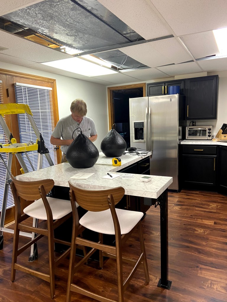 Lighting was an important part of the overall design, because as you can see in the photos the room is equipped with rather harsh florescent panels. The island pendants serve completely as ambiance lights. The light fixture over the sink combines ambiance with task lighting, shining proper light to do dishes, but not too bright. Then we installed under cabinet lighting between the sink and the stove for additional task lighting.