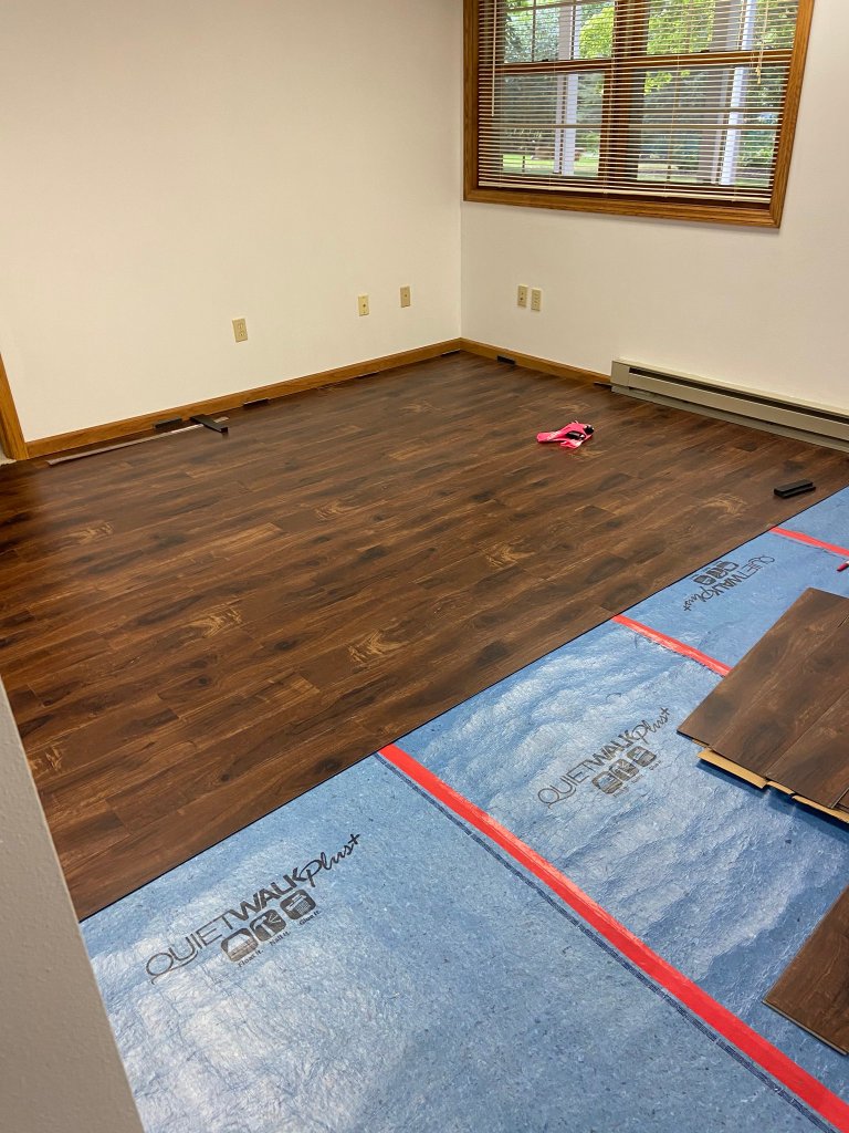 The only easy part about installing vinyl plank flooring is putting down the blue underlayment. It took a lot of sweat and tears those first few rows to figure out how to attach each board without leaving any seams and without dislodging other planks.